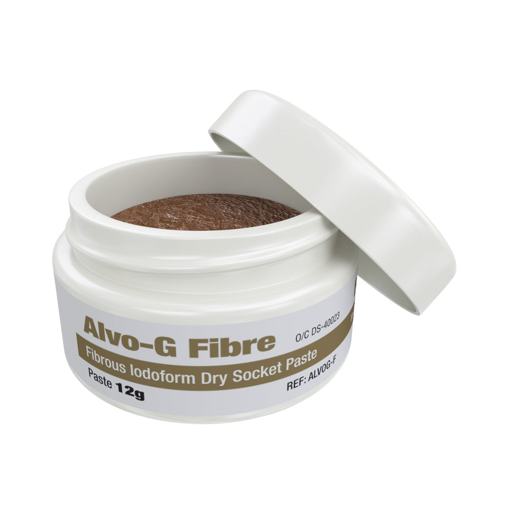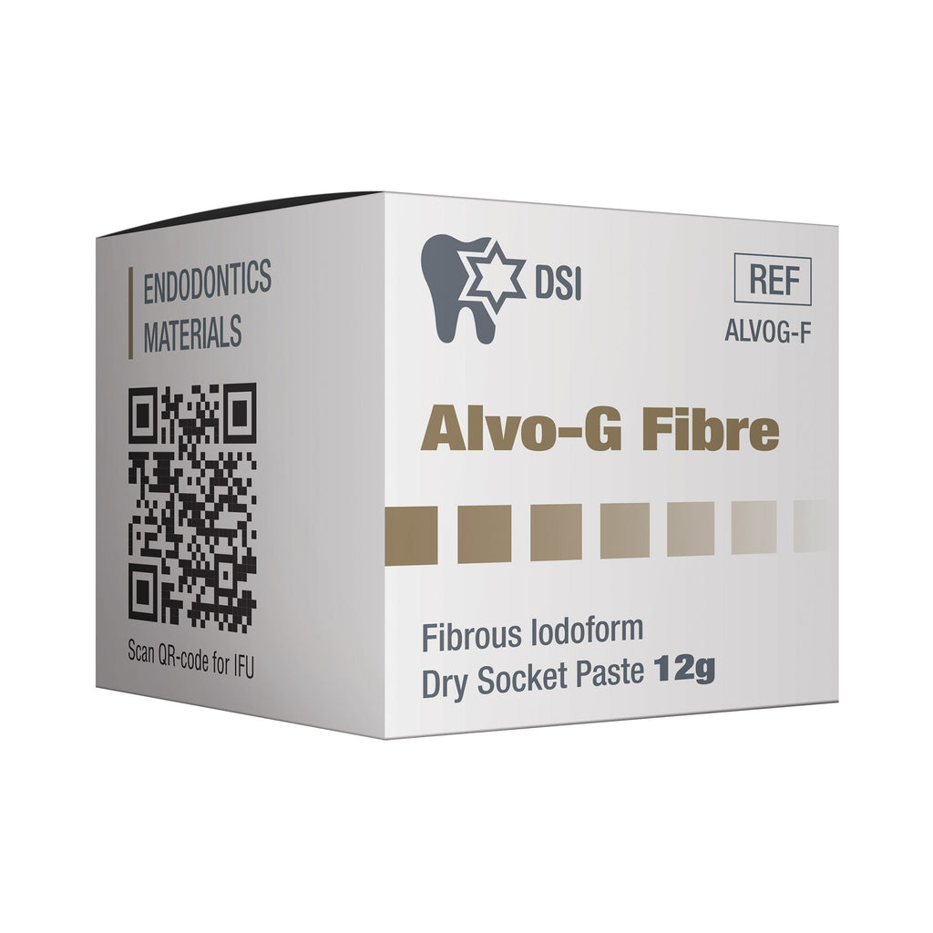 DSI Alvo-G Fibre is a special paste that is used for dry socket treatment and post-extraction dressing. It boosts the healing process and avoids complications from tooth extraction. The constituents in this paste provide analgesic and anti-microbial effects, shielding alveolar tissues. Additionally, there are analgesic and anti-microbial elements such as; eugenol, butamben, and iodoform within the paste which help to expand its healing properties.